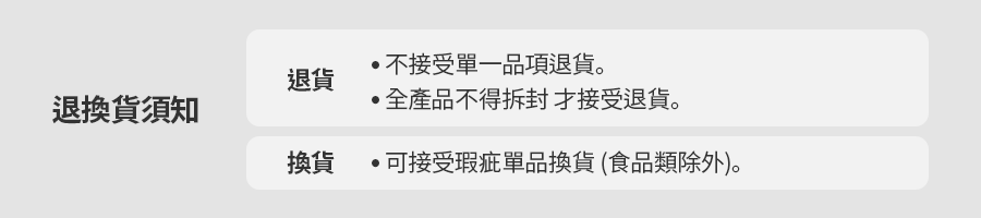 - 本公司受理會員更換產品之服務,限於在運送途中損壞、錯誤交貨或瑕疵品。