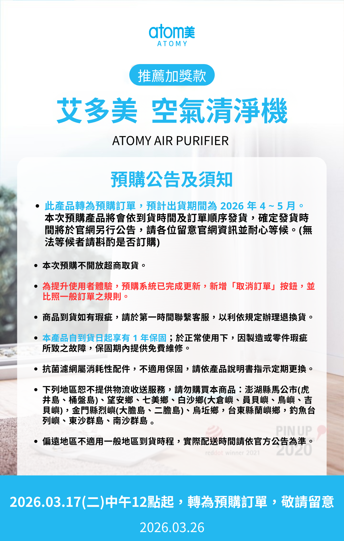 * 外島、偏遠山區配送可能有所延誤、天然災害、不可抗力之因素(部分商品缺貨、收件資料有誤)可能造成配送進度延誤,